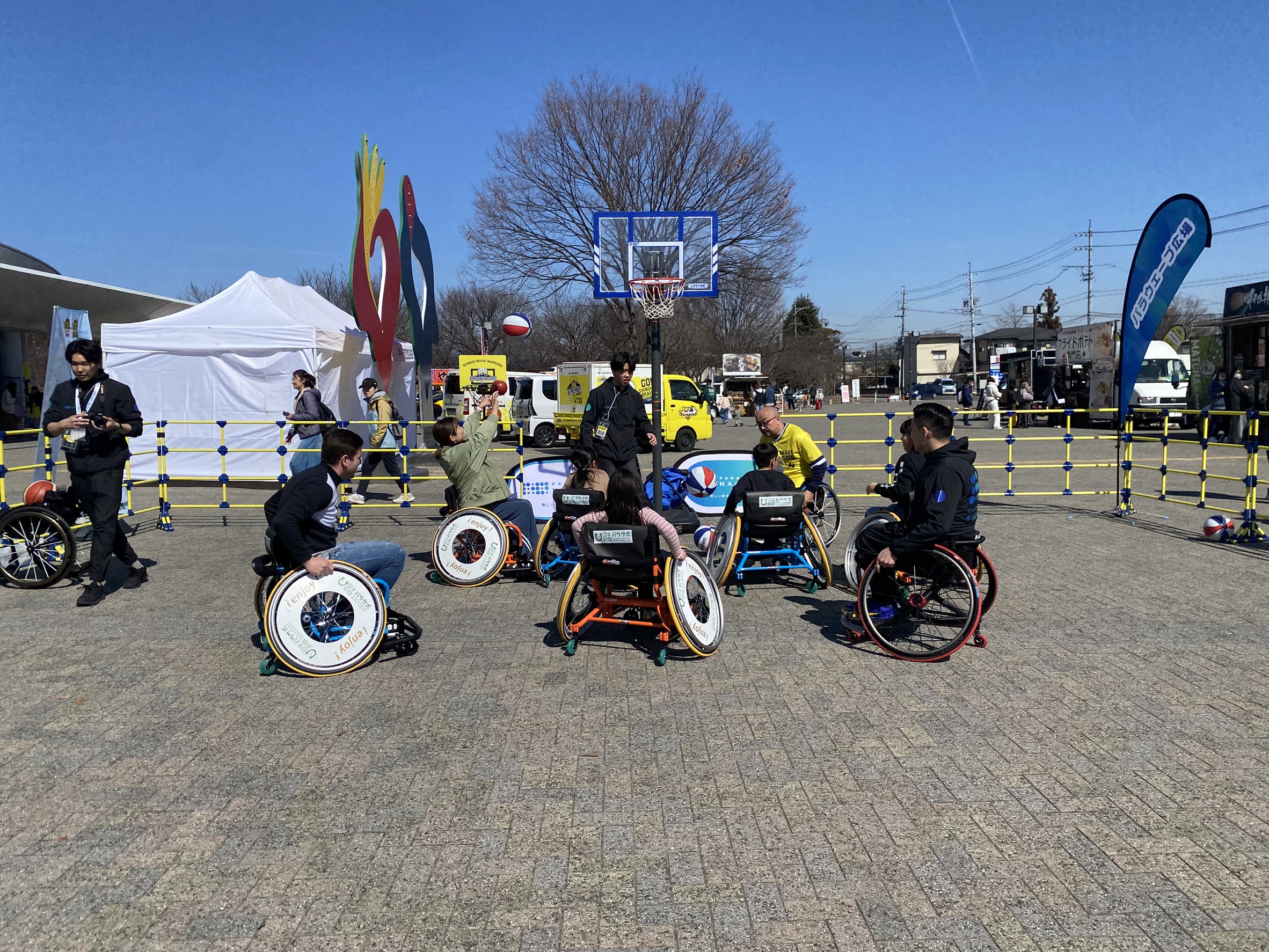 (1)車いすバスケットボール体験(屋外正面入口前)