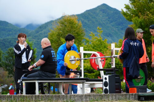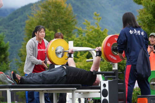 2028年に開催される信州やまなみ国スポでは、村の隣の安曇野市穂高でウエイトリフティング競技が行われるため、その周知も兼ねた出展でしたが、併せてパラリンピックの競技でもある「パラ・パワーリフティング」の体験も実施していただきました。