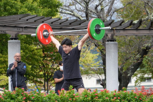 2025年国民スポーツ大会県代表の横山幸次郎選手(県ウェイトリフティング協会)による「スナッチ」のデモンストレーション