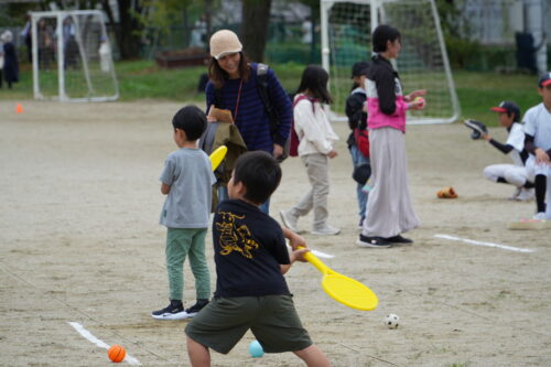 野球はおもちゃのテニスラケットを使って未就学児も楽しめるように工夫