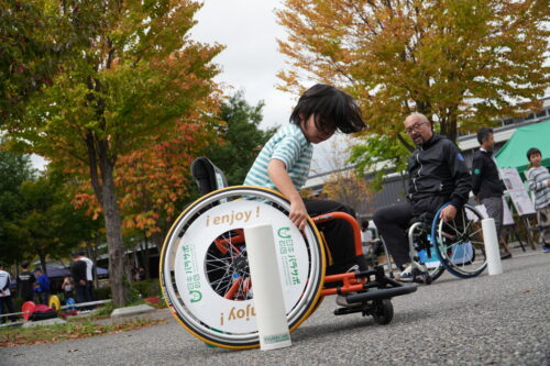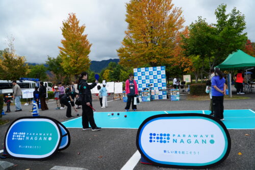 パラウェーブNAGANOのブースでは恒例の「ボッチャ」に加え、今回初めての取組として車いすでの「スラローム」のタイムアタックを体験してもらいました。