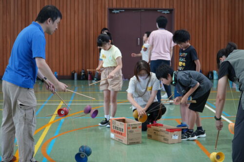 このほか、「昔遊び体験」では塩尻市で活動するNPO法人わおんが講師となり、「皿回し」「ヨーヨー」「ディアボロ」など、様々な遊びを行ったほか、「ボッチャ」も含めて4つの体験を班ごとに30分ずつ回し、計2時間にわたって子どもたちは体を動かして楽しみました。